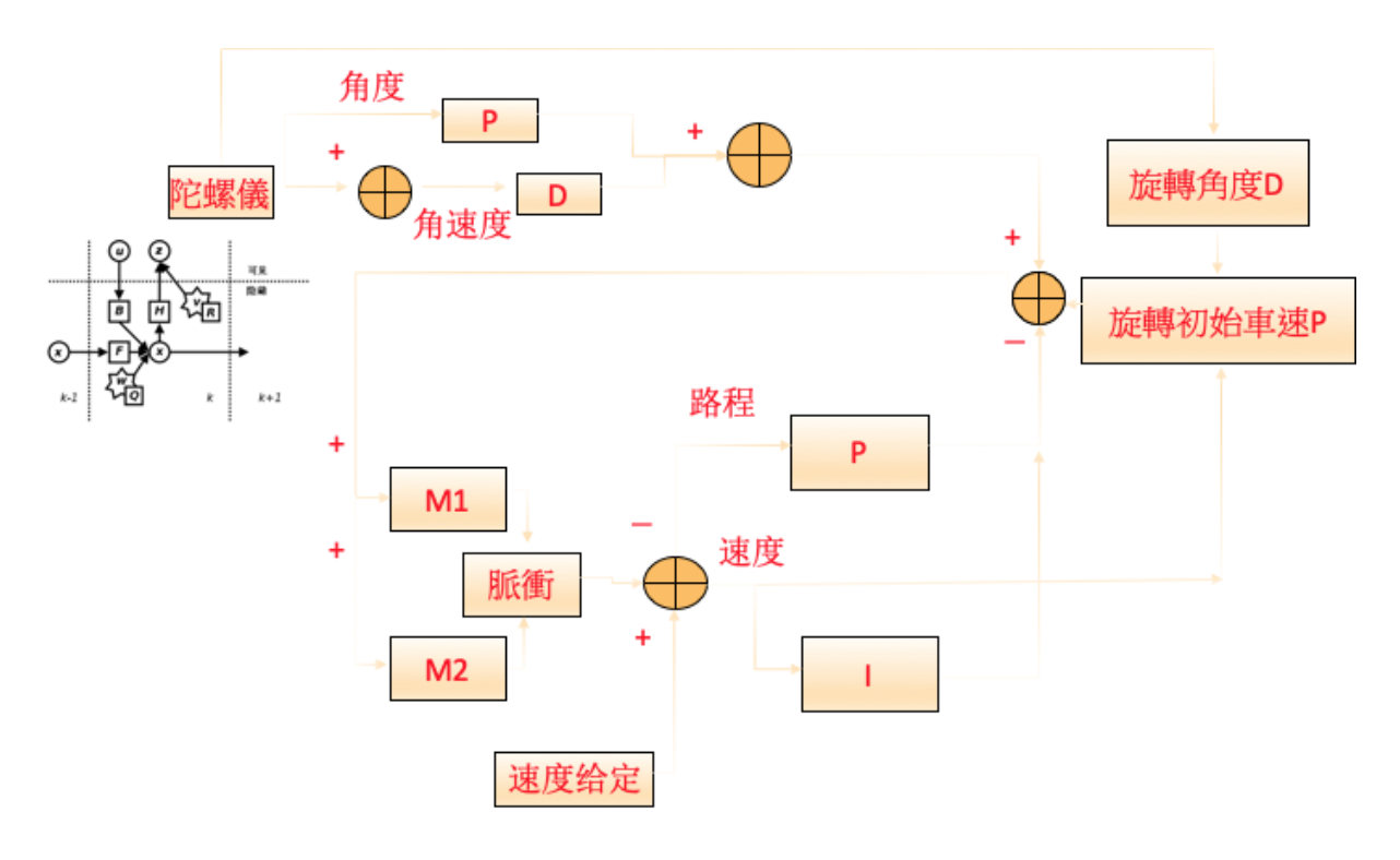 原理就是應用負反饋控制,由測量到的角度和自身平衡時的自然角度的差作為誤差,通過一個叫做PID的控制算法來控制電機轉速和轉向,偏離目標角度時,往前倒就向前跑一點,往後倒就向後跑一點,只要這個過程做的足夠快,參數合適,就能穩穩地站在原地。通過MPU6050檢測小車的角度作為PID 函數的輸入,設定一個平衡角度作為PID函數的目標值,然後把PID函數的輸出作為PWM值驅動電機。然而一般市售的平衡車其實不不穩定,仍然會出現小幅度顯而易見的晃動,因此我們希望在不修改硬體的情況下,實現軟體演算法的平衡,我們在陀螺儀的偵測上加上Kalman Filter,它是一種自回歸濾波器,能夠從一系列的不完全及包含雜訊的測量中,估計動態系統的狀態。卡爾曼濾波會根據各測量量在不同時間下的值,考慮各時間下的聯合分布,再產生對未知變數的估計,因此會比只以單一測量為基礎的估計方式要準。加上這個濾波器後,再調上適合這個平地或斜坡的參數,我們可以實現看起來像不動般停在原地,不論在平地或斜坡上都可以。
