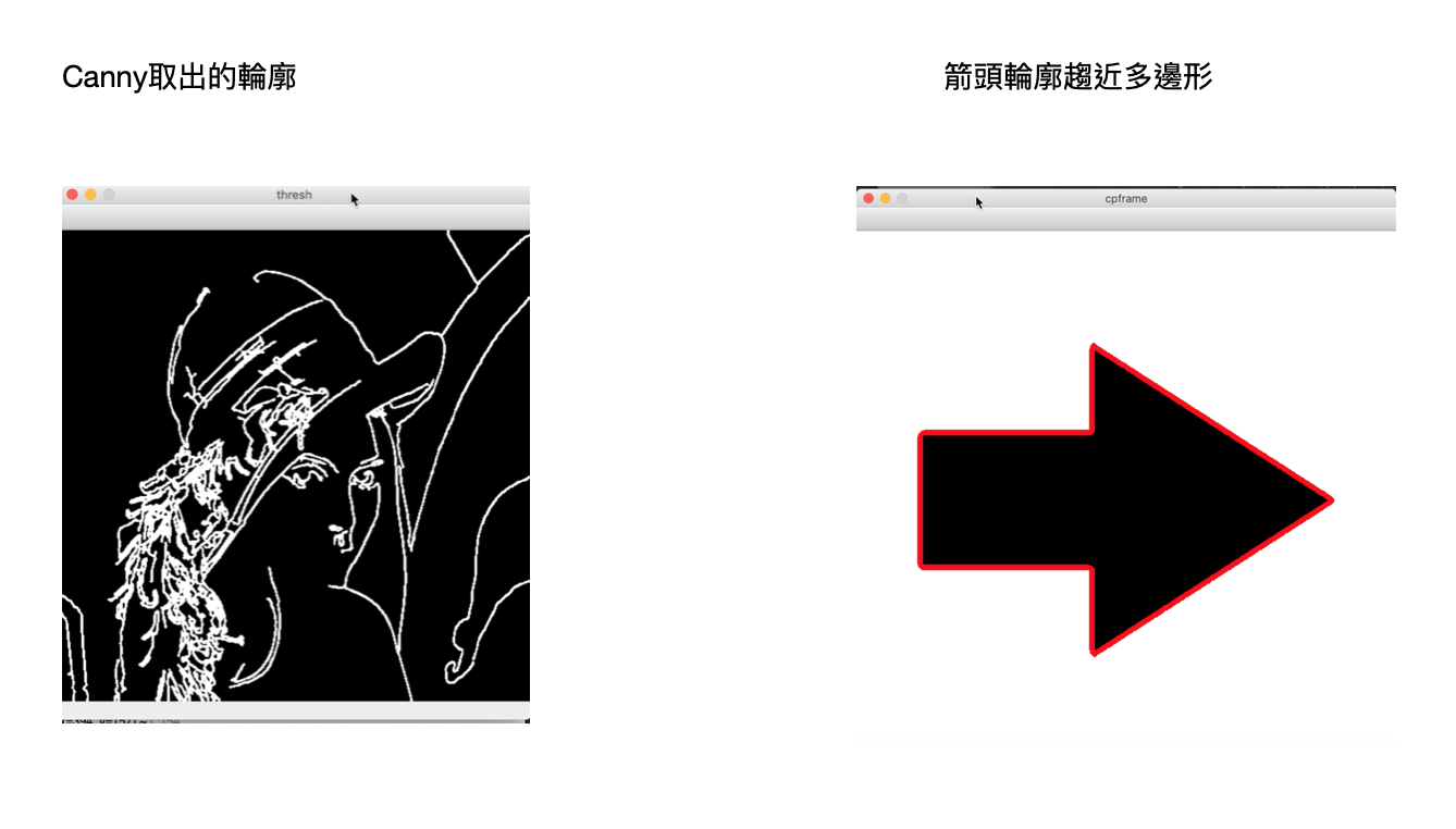 先用灰階的方式讀取,再用高斯分佈去模糊、canny演算法取邊緣去描繪輪廓。有了輪廓之後,用opencv的演算法去逼近成多邊形,取出箭頭的七個頂點座標,用我們的演算法去判定是不是箭頭。